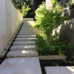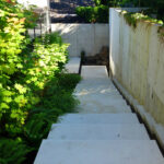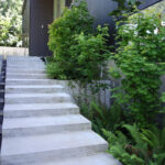The goal here was to celebrate the ascent from the auto court to the front door of the home by creating a series of gardens linked together by a central staircase. The stairs in this case are what we call a “stramp”, using generous treads and shallow risers to take the sting out of the climb.