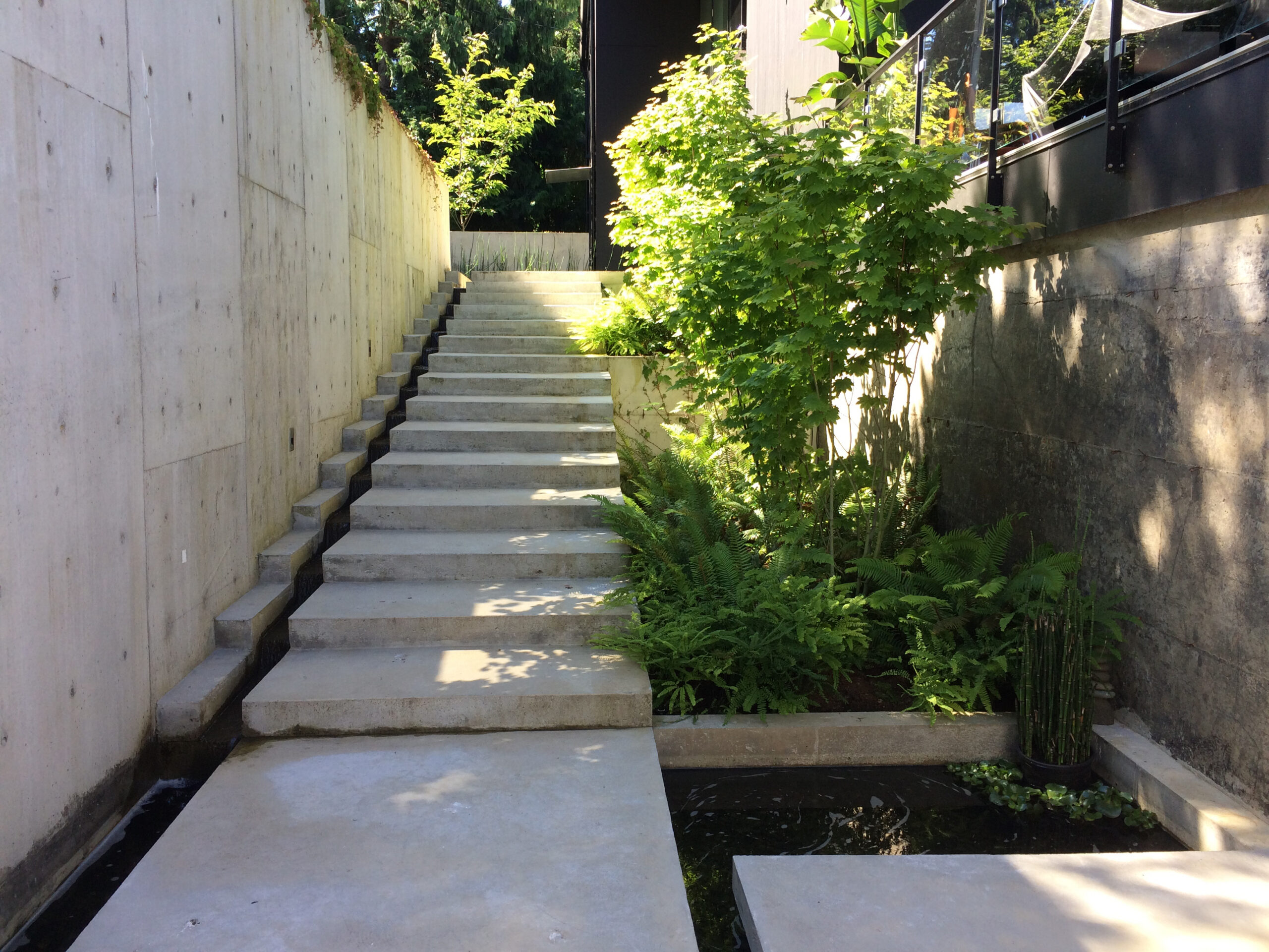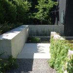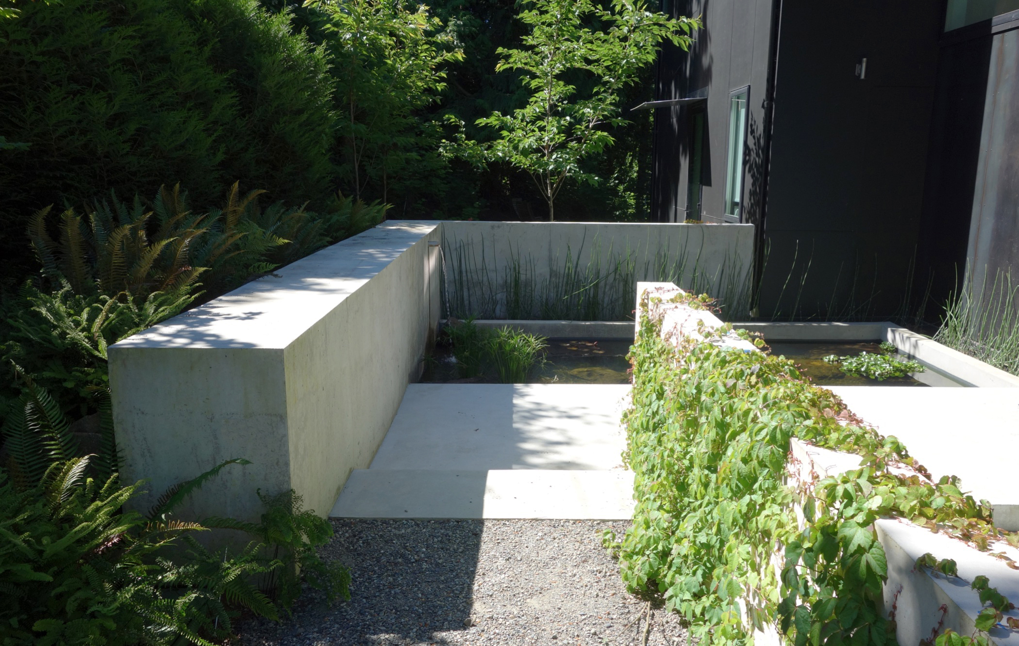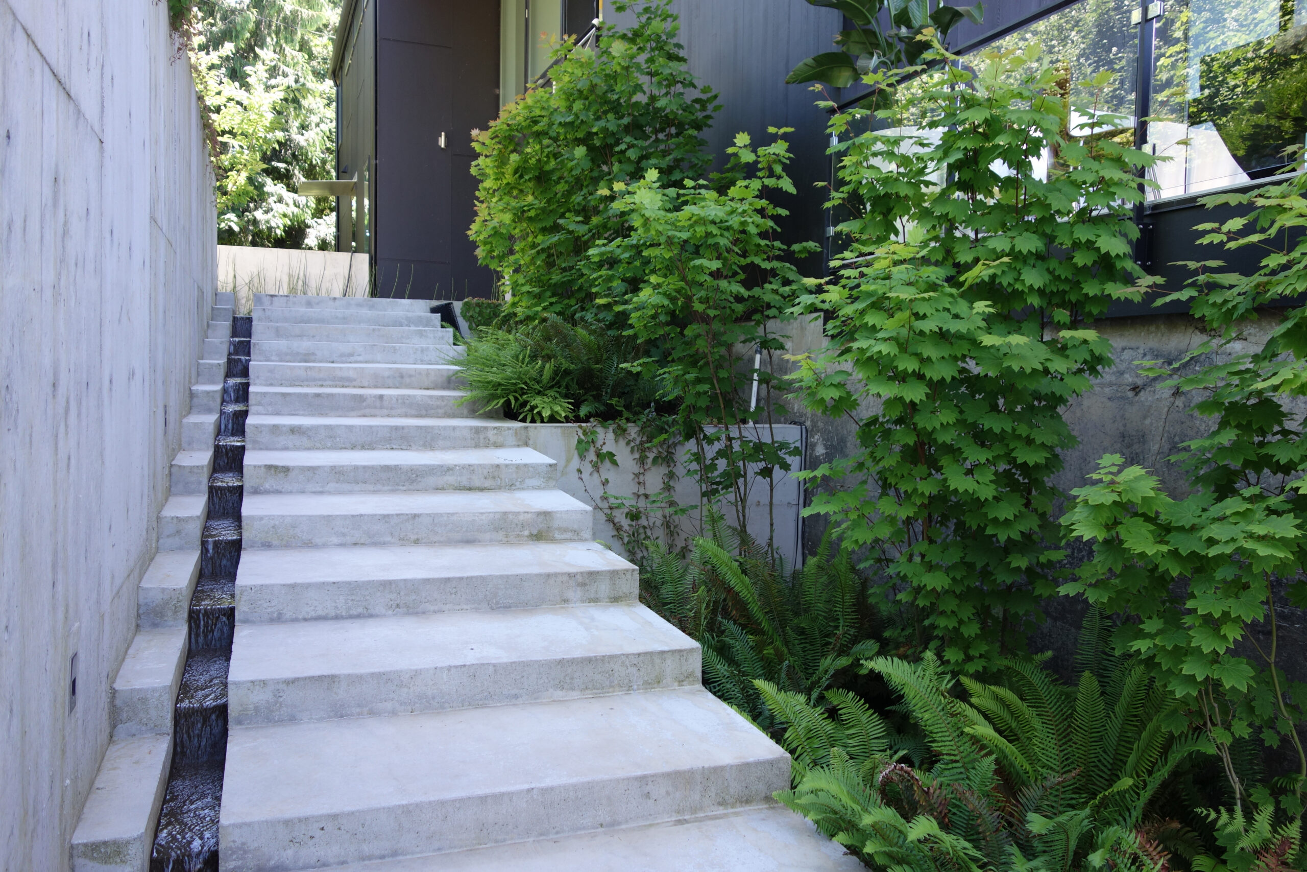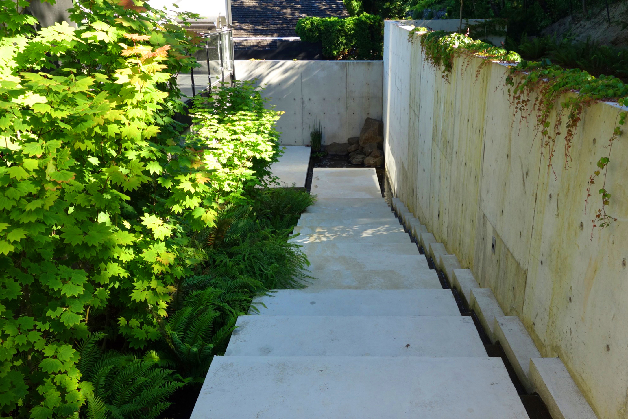 Plant materials are primarily native to the neighborhood. The house is wrapped by woods on three sides, so we selected a limited palette of choice native plants to complete the composition. Another benefit of this garden’s geometry is that it looks quite different when ascending and descending, yet magical in both directions.