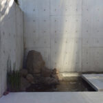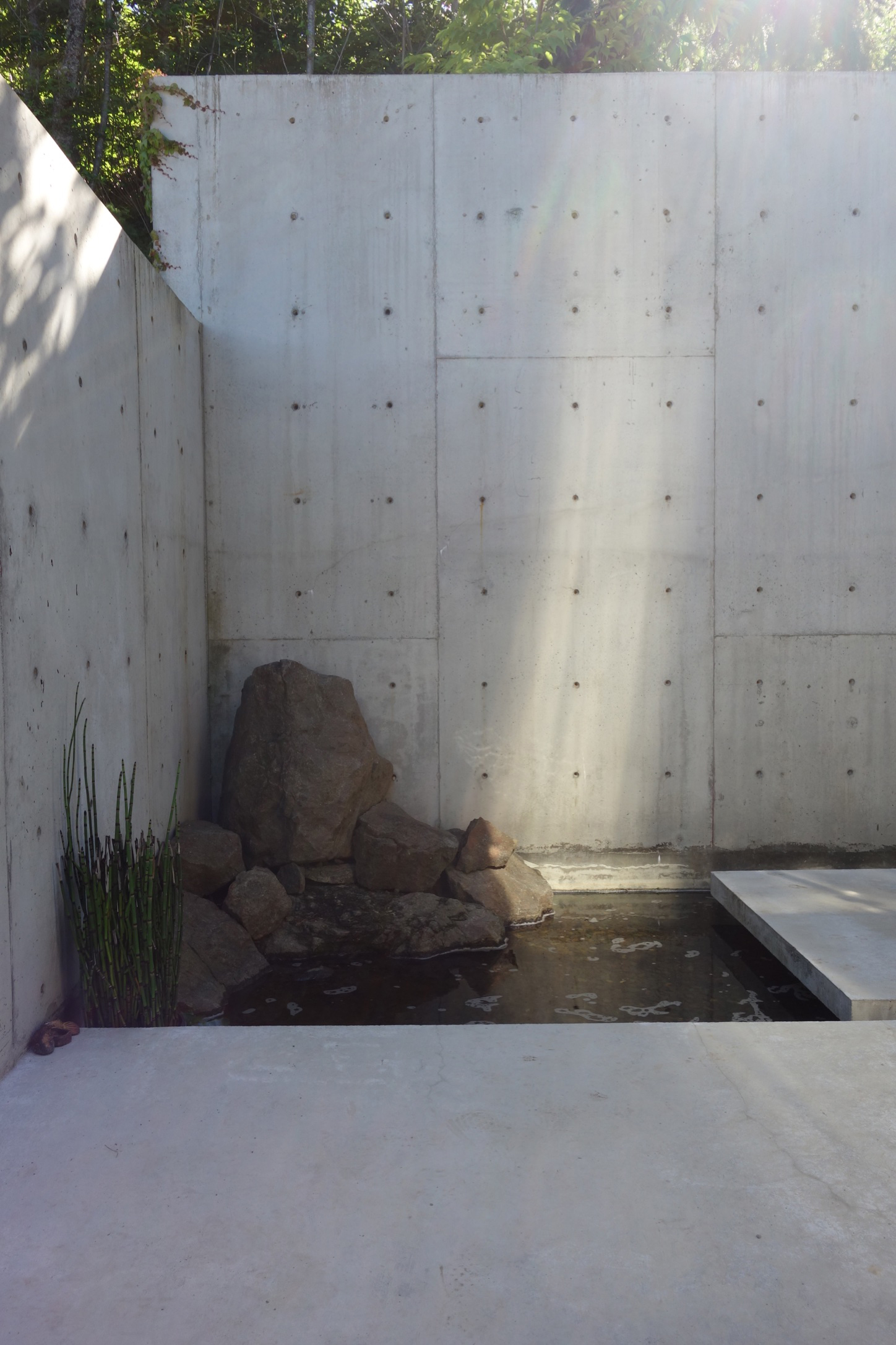 The different levels are linked together by water. A hillside spout which appears to channel a natural spring pours into an upper pool, then down a staircase runnel, and ends in a lower pool. The sound and lambent light of the water, illuminated at night, adds poetry and a sense of heightened anticipation as one ascends the stairs.